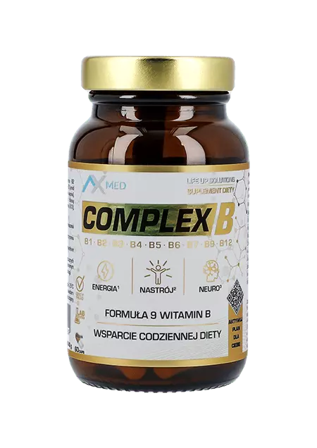 - Witamina B – COMPLEX B – formuła 9 witamin B1, B2, B3, B4, B5, B6, B7, B9, B12, poprawia nastrój, pamięć i koncentrację. Wspiera funkcjonowanie układu nerwowego, jak również zdrowie skóry i włosów.